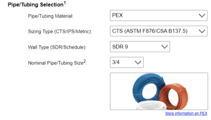 The Plastic Pipe Institute has accumulated information from all PEX manufacturers to simplify head loss calculations. Simply select PEX, ASTM F876, pipe size, length, and water parameters, and the calculator not only tells you head loss in ft. of head, but also PSI, and what the velocity is. For PEX, 8 ft/sec. is the max.; 4 ft./sec. for metal pipe.